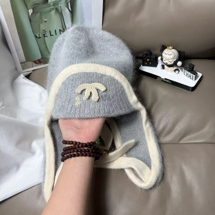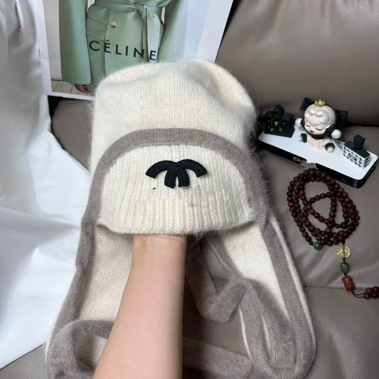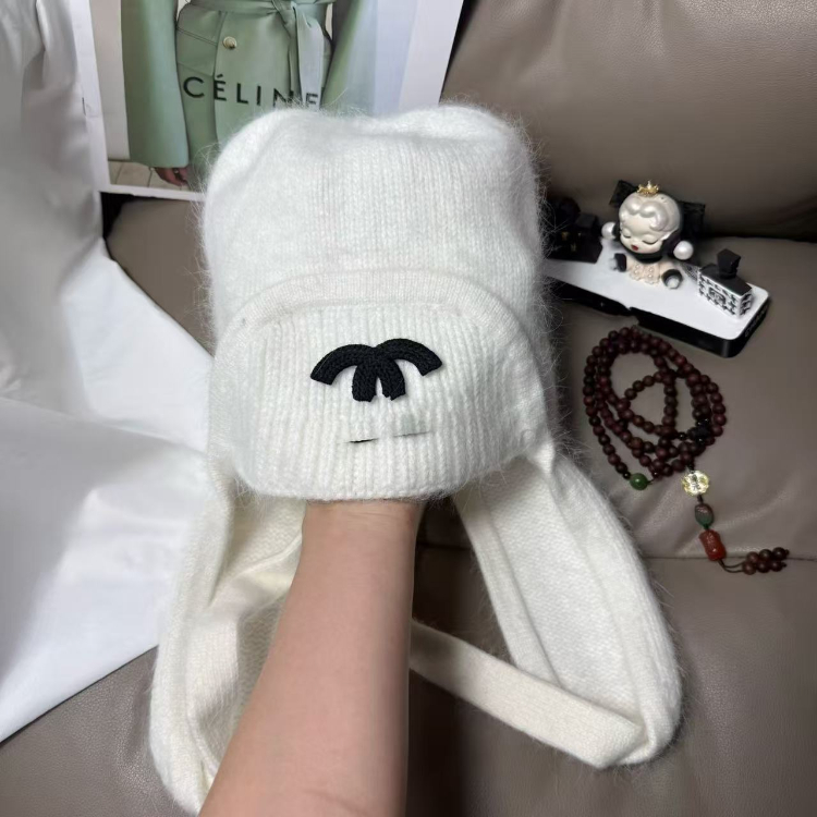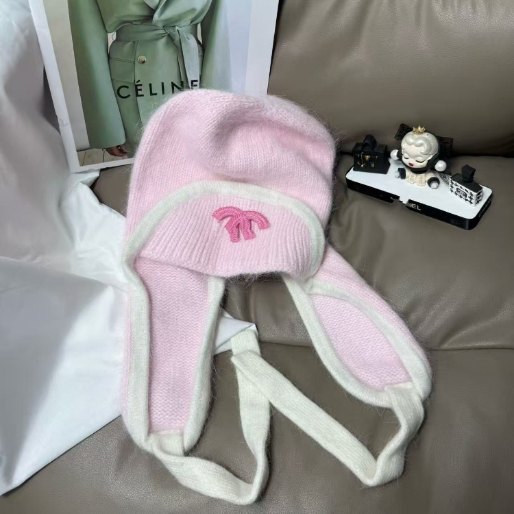 Chanel new rabbit fur warm knitted hat with ear flaps-5975
